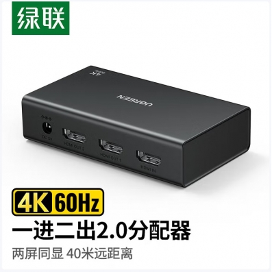 绿联 HDMI分配器1进2出 一进二出4K数字高清视频分屏器 笔记本电脑电视盒子接显示器投影仪一分二 HDMI2.0分配器【4K/60Hz】90804