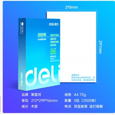 得力(deli)莱茵河A4打印纸 70g500张*5包一箱 口碑优选复印纸 双面草稿纸 整箱2500张7401