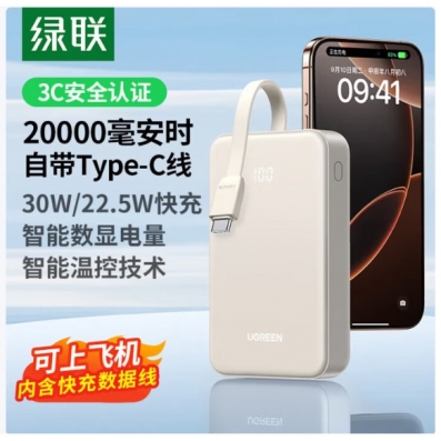 绿联(UGREEN)UgreenPB521移动电源20000毫安30W充电宝自带线适用苹果45207