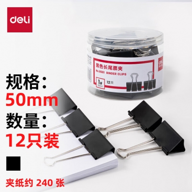得力(deli)12只50mm黑色长尾夹票夹 大号金属燕尾夹票据文件夹子 办公用品 12只/筒 8561