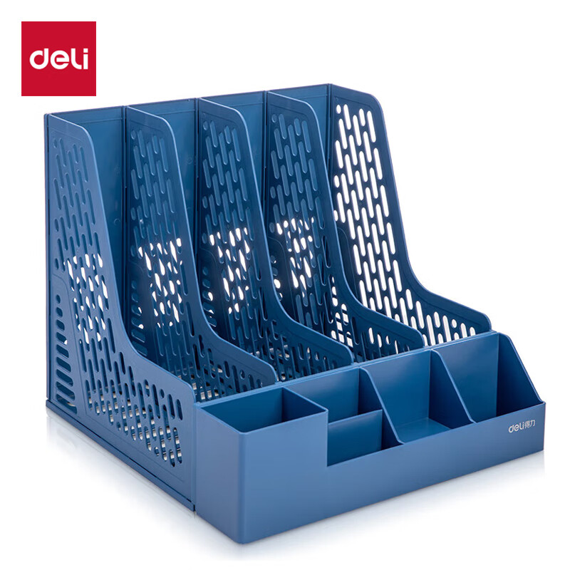 得力(deli)四联带笔筒收纳桌面文件框 多功能镂空文件栏/文件框/资料筐 蓝色78981