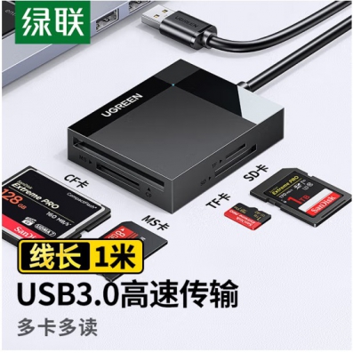 绿联 USB3.0 高速读卡器 多功能四合一读卡器 多卡多读 SD TF CF MS 1m