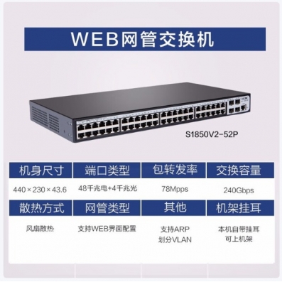 华三 H3C 48口企业级 全千兆交换机 S1850V2-52P 48口千兆电+4口千兆光 二层 网管