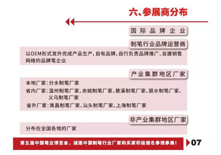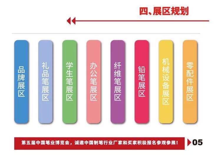 本届博览会的主题是“转型升级,合作创新”,主要目的是“牵线搭桥”。本届博览会的展区规划有品牌展区、礼品笔展区、学生笔展区、办公笔展区、纤维笔展区、铅笔展区、机械设备展区、零配件展区共八大展区。参展商群体将有国内外知名品牌企业、塑料礼品笔厂家、金属礼品笔厂家、学生笔OEM厂家、学生笔品牌运营商、办公笔OEM厂家、办公笔品牌运营商、纤维笔OEM厂家、纤维笔品牌运营商、铅笔OEM厂家、铅笔品牌运营商、机械设备厂家、零配件厂家;将有来自分水本地、温州、丽水、宁波、余姚、慈溪、南昌、汕头、上海、广州乃至分布全国各地的厂家参展。