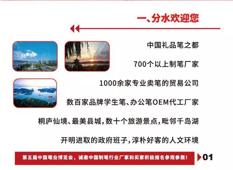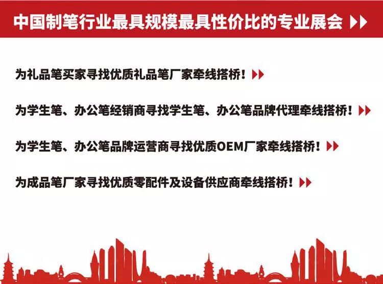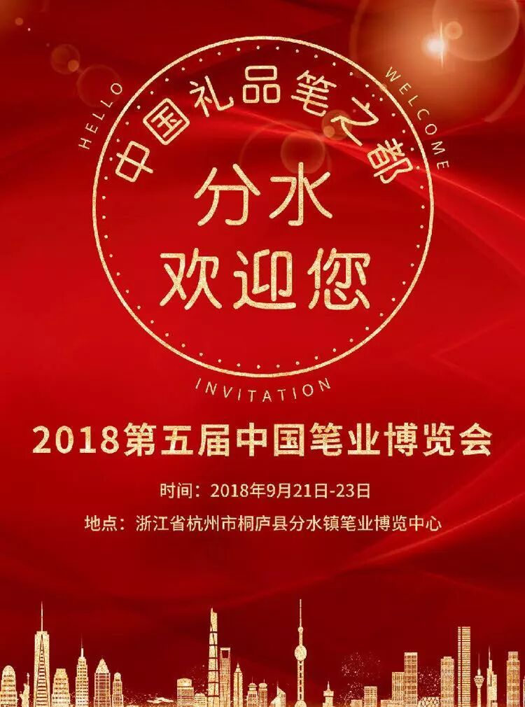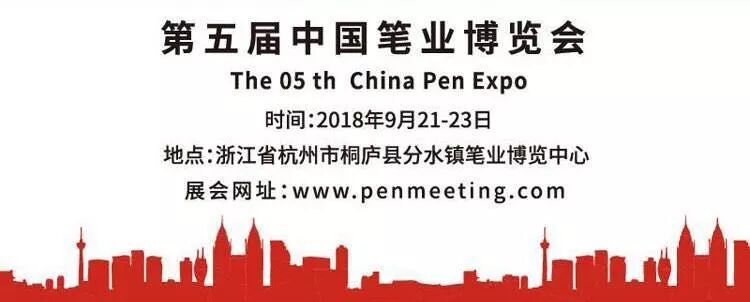 2018第五届中国笔业博览会将于2018年9月21至23日在浙江省杭州市桐庐县分水镇笔业博览中心隆重举行,桐庐县分水镇是中国礼品笔之都。为企业进一步拓展企业产品的商务合作渠道,协会将组织会员企业统一参观,诚邀各企业积极参与!