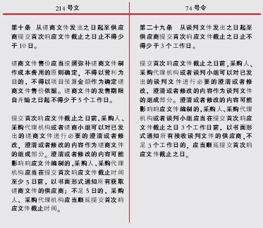 此外,214号文中还有一些规定与74号令基本相同。例如:磋商文件内容和谈判文件内容的规定基本相同,214号文增加了“政府采购政策需求”“不予退还保证金的情形”“响应文件的开启时间”这3项具体的内容,并将“采购程序”具体化为评审程序、评审方法、评审标准;采用公告方式邀请供应商的,214号文对公告内容有规定(214号文第七条),而74号令对竞争性谈判的谈判公告内容没有规定。这些差异体现出214号文的规定在74号令的基础上有了进一步的完善,这是实践经验积累使然。